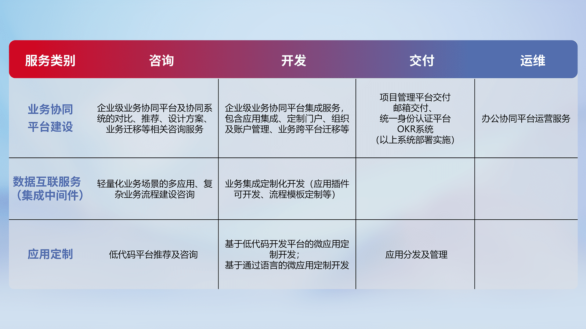 针对钉钉、、、企微、、、IDaas等平台级产品提供产品的规划、、、方案、、、、交付、、、、定制化开发等服务,,,实现如统一协同办公、、、、智能客户服务、、、混合会议管理、、、、智能数据查询、、、等业务场景,,,,实现数字化转型。。。。