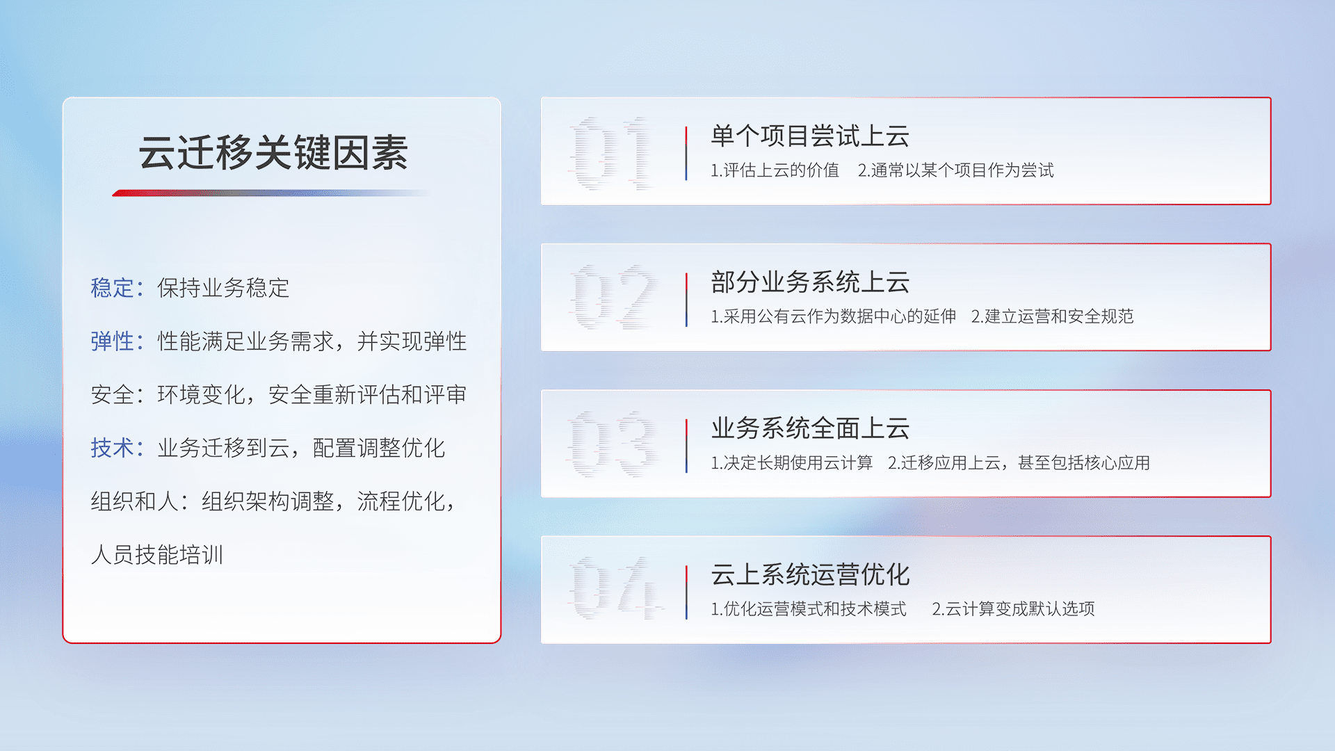 结合实际业务,,,从规划设计、、、、云平台选型、、、、云原生改造、、、数据迁移、、、集成交付,,迁移全过程为客户识别最佳上云路径,,做好风险识别管理,,设计网络架构、、、、身份权限、、安全审计合规、、操作审计、、、、日志审计、、、监控告警策略、、、多站点容灾设计等,,,对云上基础设施进行整体规划,,,提升IT治理水平,,,,以满足弹性、、高可用、、高性能的需求。。
