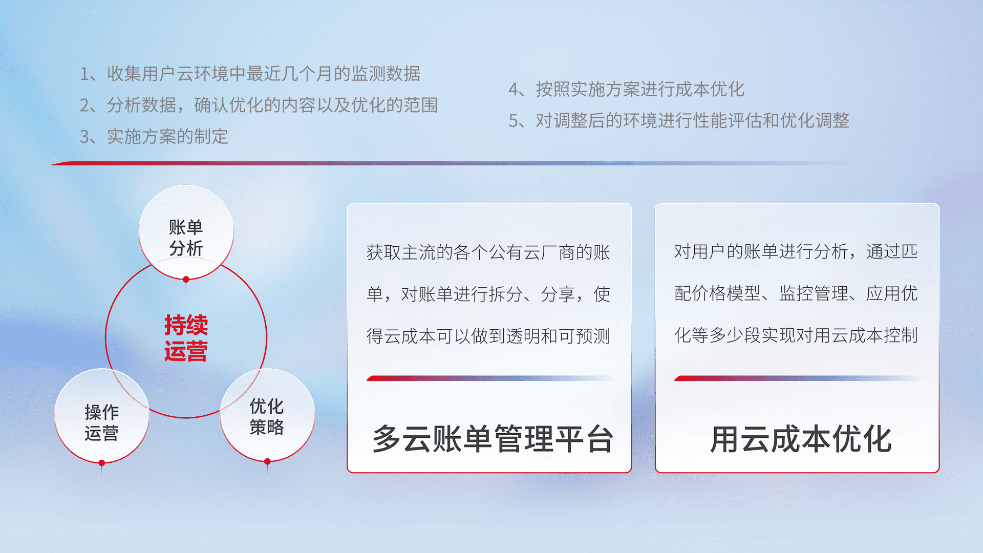 通过多云纳管,,以统一的资源数据模型把客户的云资源进行抽象和封装,,,进而实现对多云资源的统一操作,,,保障云资源管理的可靠性、、稳定性与可用性。。。量身定制化运维内容,,,配置、、、、开发运维、、、补丁管理、、、备份、、、、监控、、、认证和访问管理、、、审计和日常巡检等,,,,保障在用云过程中的可靠度,,,,稳定度以及高可用率。。。。